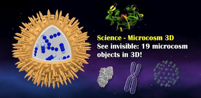 Con esta aplicación tendremos la posibilidad de ver microorganismos en 3D y con una buena descripción. Átomos, virus, moléculas, etc. Todo en nuestra pantalla de tablet. En la versión gratuita sólo disponemos de seis modelos. Para verlos todos, deberemos pagar el 1’99$ de la versión completa. Vale la pena echarle un vistazo a la versión gratuita antes de comprar nada.